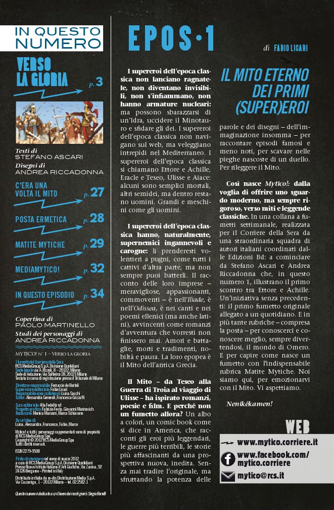 Al confine tra storia e leggenda, i grandi racconti epici e le gesta degli eroi mitologici conservano intatto il loro fascino di sempre. La collana Mytico! racconta quelle immense avventure con il raro potere di abbinare conoscenza e piacere di lettura, grazie al rigore delle fonti e al magico linguaggio del disegno a fumetti. La storia, i miti e le saghe degli eroi tornano attuali grazie a questa nuova iniziativa editoriale del Corriere della Sera, che ha ideato una collana illustrata rivolta prevalentemente al pubblico giovane, ne ha sviluppato la filosofia, e ha appositamente incaricato dell’opera un pool di disegnatori.